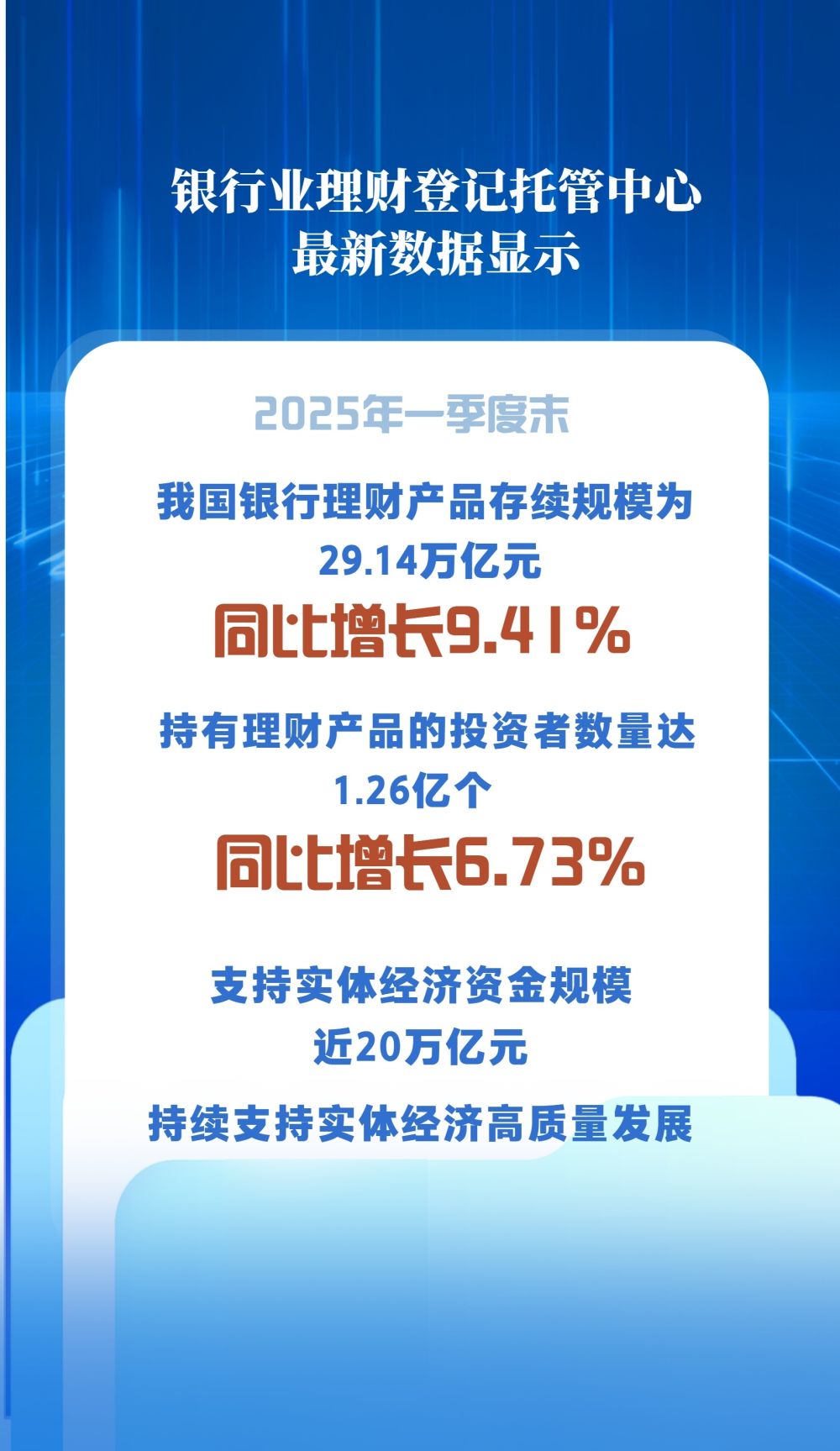 银行业理财登记托管中心最新数据显示,截至2025年一季度末,我国银行理财产品存续规模29.14万亿元,同比增长9.41%,行业呈现良好发展态势。