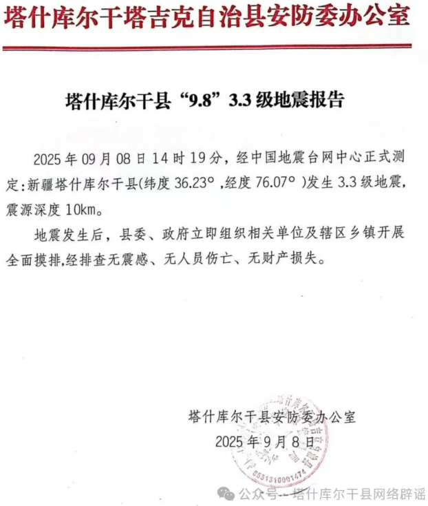 经塔什库尔干县安防委办公室对辖区乡镇全面摸排,地震无明显震感、未造成人员伤亡、无财产损失。