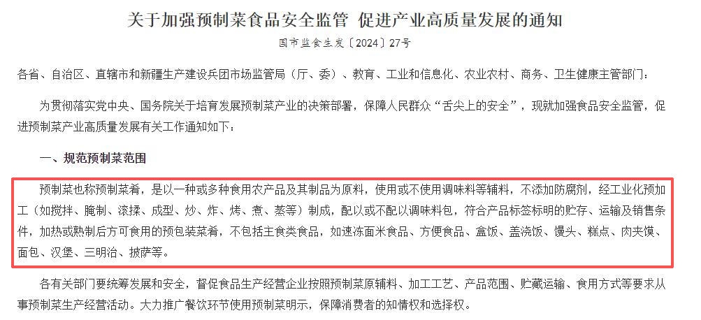 关于预制菜的定义和范围,2024年3月,市场监管总局等六部门曾联合印发相关通知。
