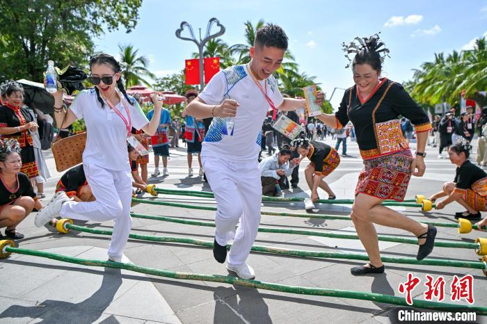 11月26日,第十二届全国少数民族传统体育运动会民族大联欢活动在海南三亚天涯海角园区举行。图为运动员体验跳竹竿舞。中新网记者 骆云飞 摄
