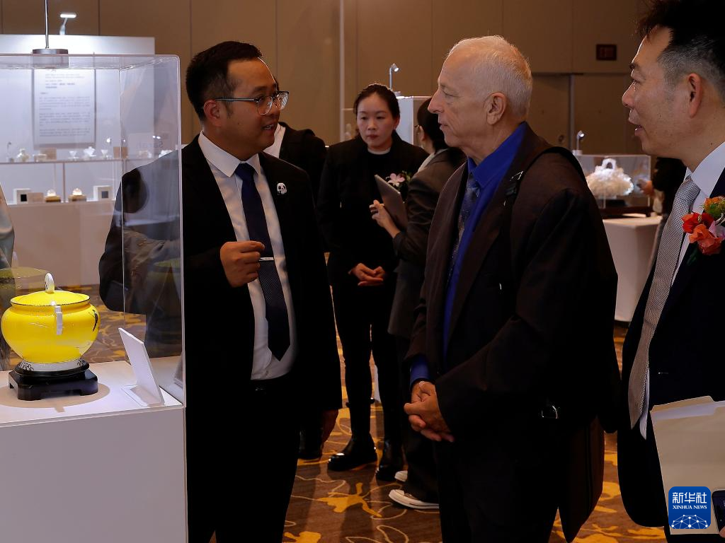 11月21日,在美国洛杉矶举行的“中国白·德化瓷”国际巡展上,观众观赏展品。新华社发(邱晨 摄)