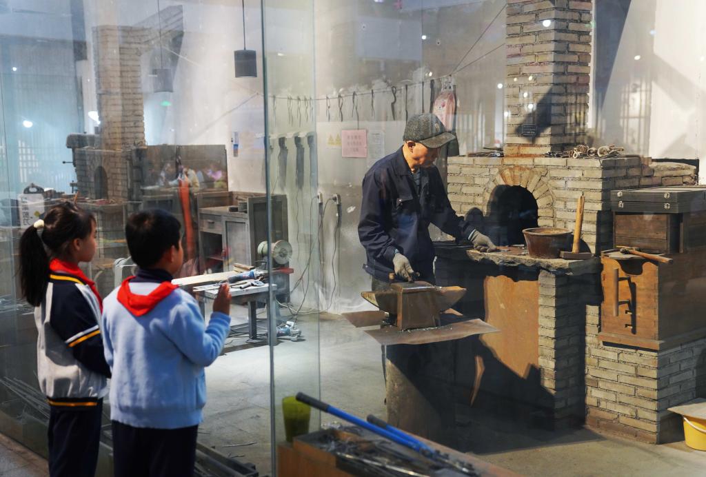 3月28日,两名小学生在杭州手工艺活态馆里观看传统剪刀制作技艺。新华社记者 王迎 摄