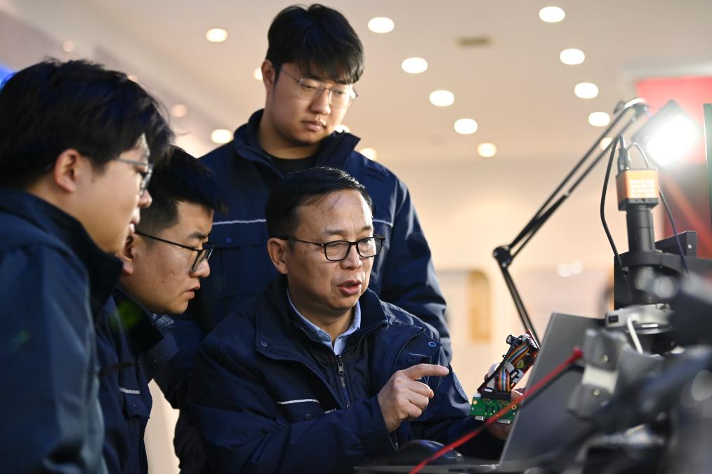 2月13日,在位于山东济南的山东电工电气设备公司工艺实验室,全国人大代表、中国电气装备集团副总经理张帆(左一)主持自粘导线固化特性实验方案讨论。新华社发(中国电气装备集团供图)
