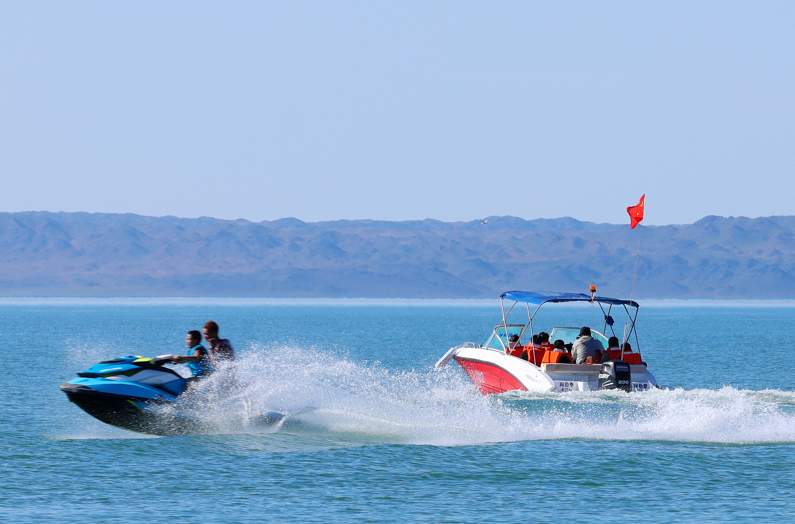 阿勒泰新闻网-阿勒泰地区融媒体中心(记者 阿尔达克·拜斯汗) 7月26日,游客在福海县乌伦古湖金沙滩景区戏水游玩。随着旅游旺季到来,福海县乌伦古湖景区吸引了众多游客前来体验水上乐趣。
