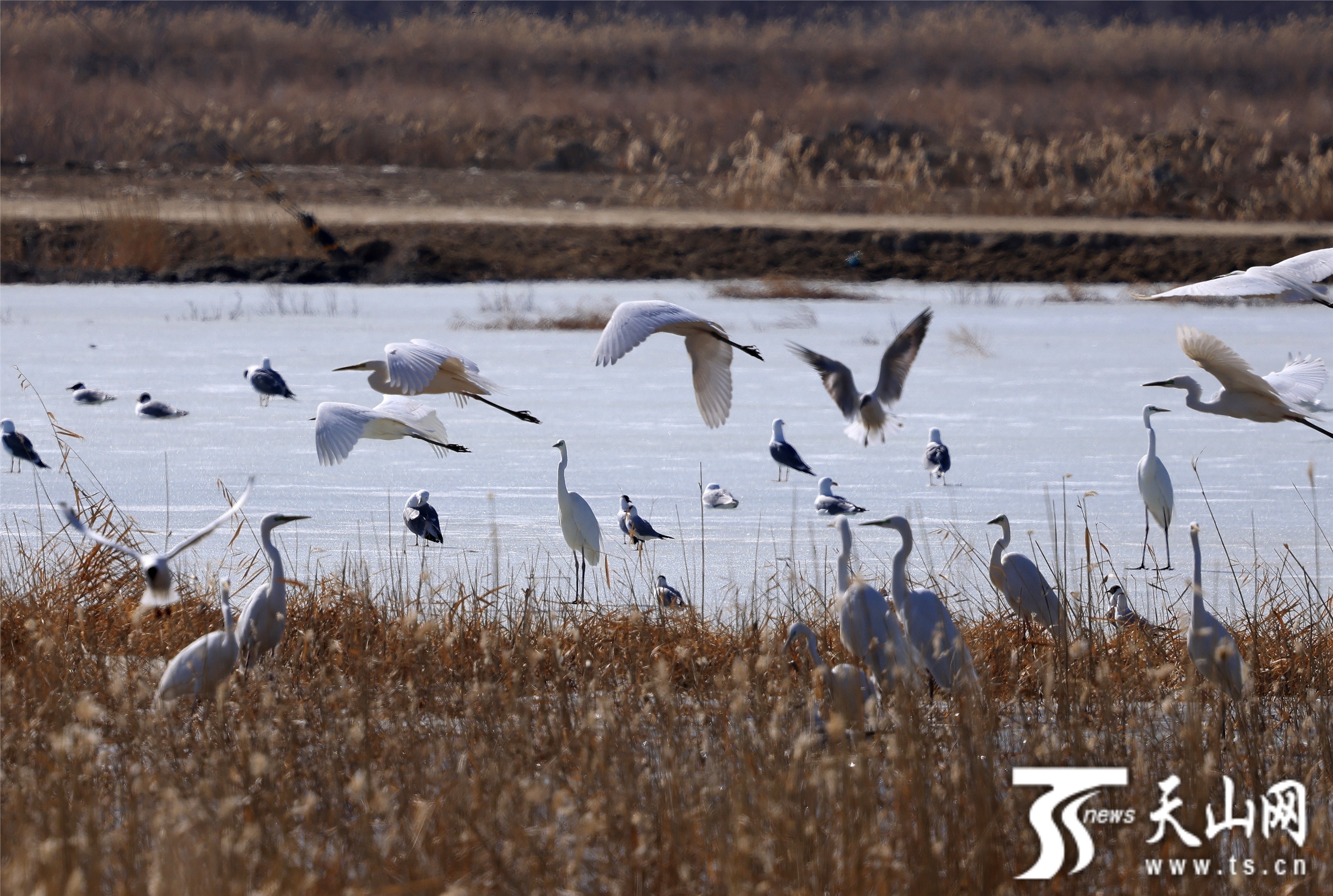 3月21日,候鸟在福海县乌伦古湖国家湿地公园休憩。进入3月,天气渐暖,冰雪消融,大批候鸟迁徙至此,良好的生态环境让这里成为候鸟的天堂。阿尔达克·拜斯汗摄