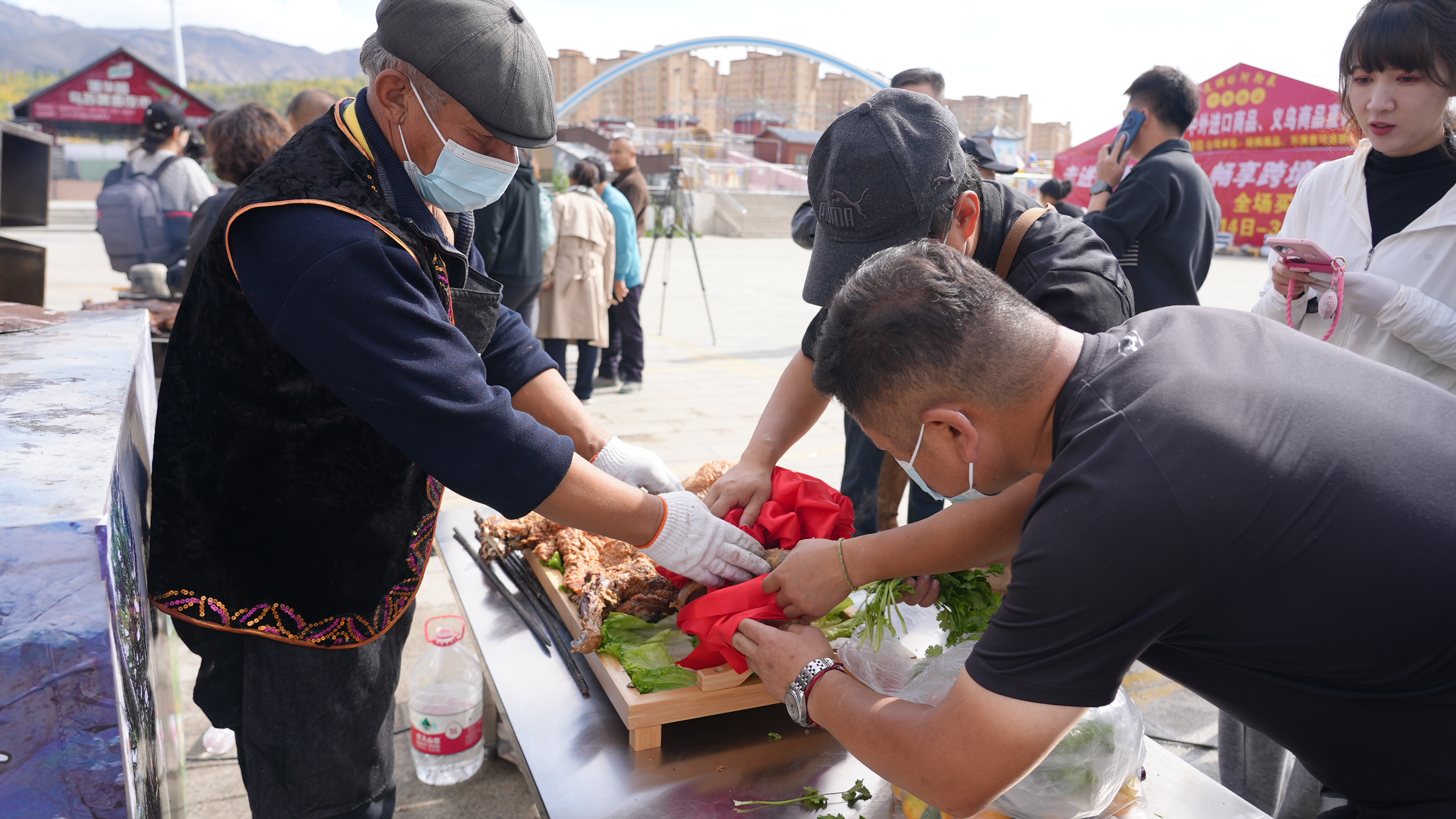 评委们逐一品尝打分,结合表皮酥脆度、肉质嫌嫩度等进行评分。最终,切木尔切克镇参赛队凭借精准的火候把控和地道的风味调配摘得一等奖。工作人员现场分切羊肉,请大家品尝。