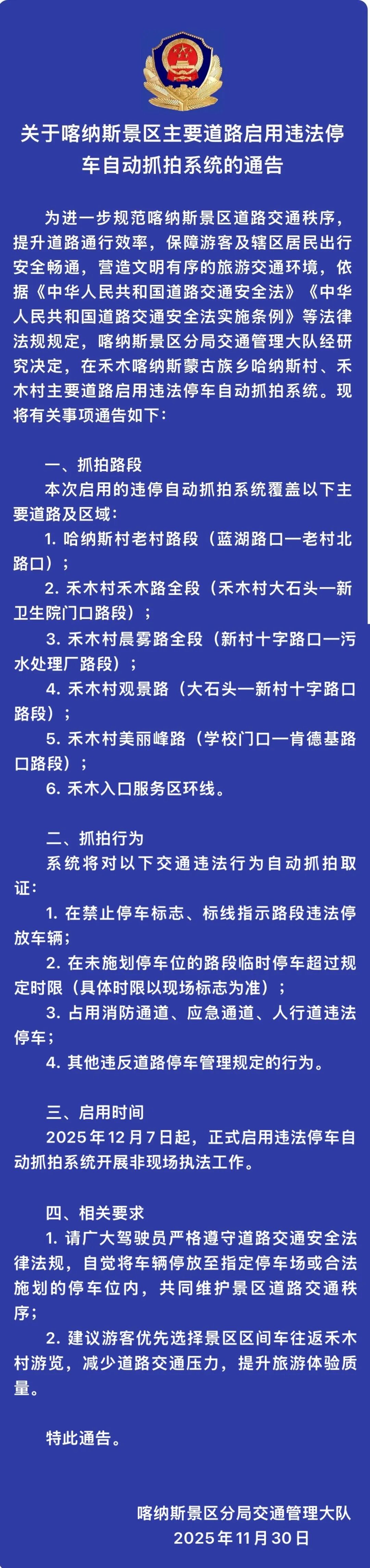 关于喀纳斯景区主要道路启用违法停车自动抓拍系统的通告