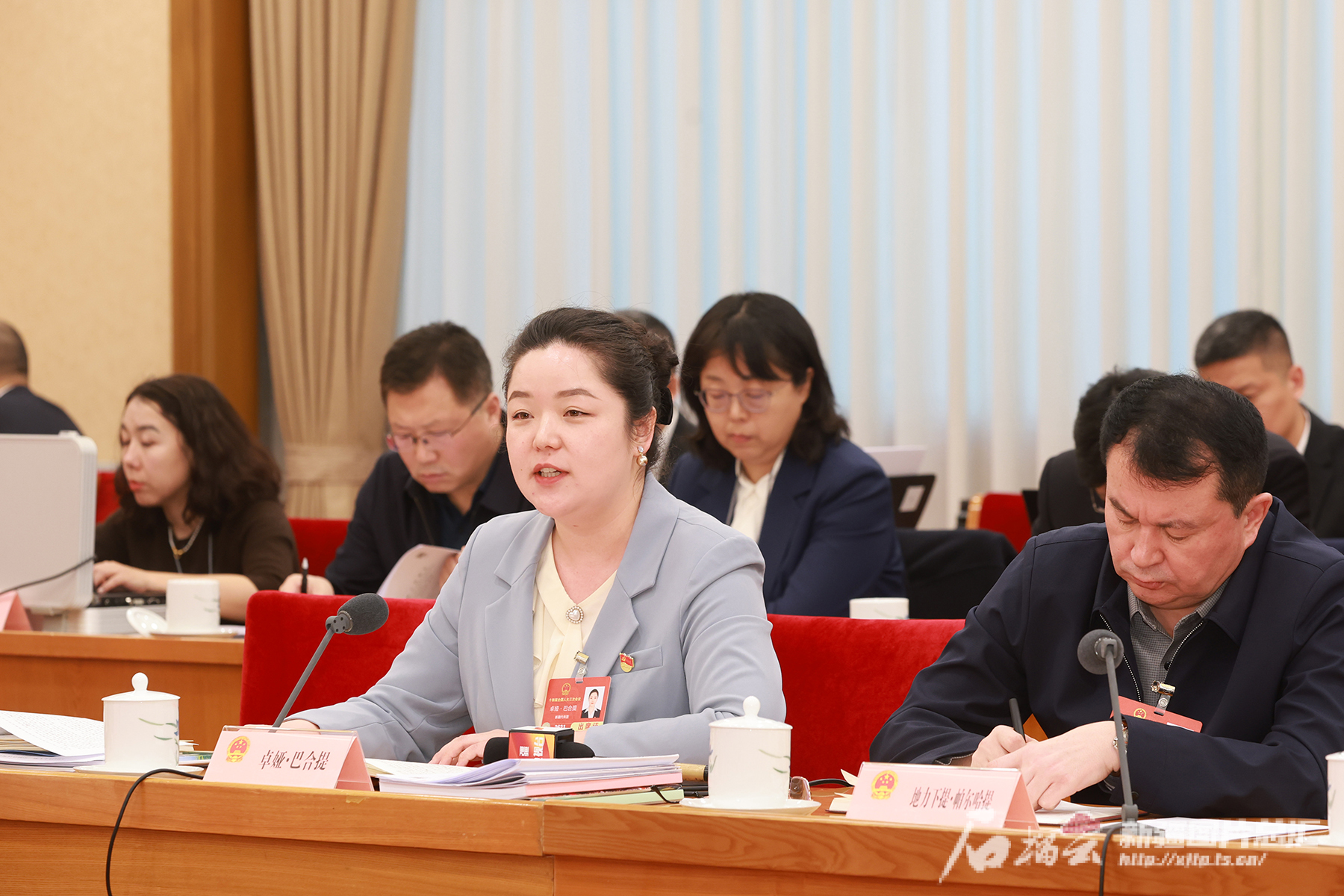 3月6日,出席十四届全国人大三次会议的新疆代表团举行小组会议审议政府工作报告。这是卓娅·巴合提代表(前左)在审议时围绕做好文物研究、阐释工作,讲好中华民族共同体故事等内容发言。天山网-新疆日报记者 崔志坚摄