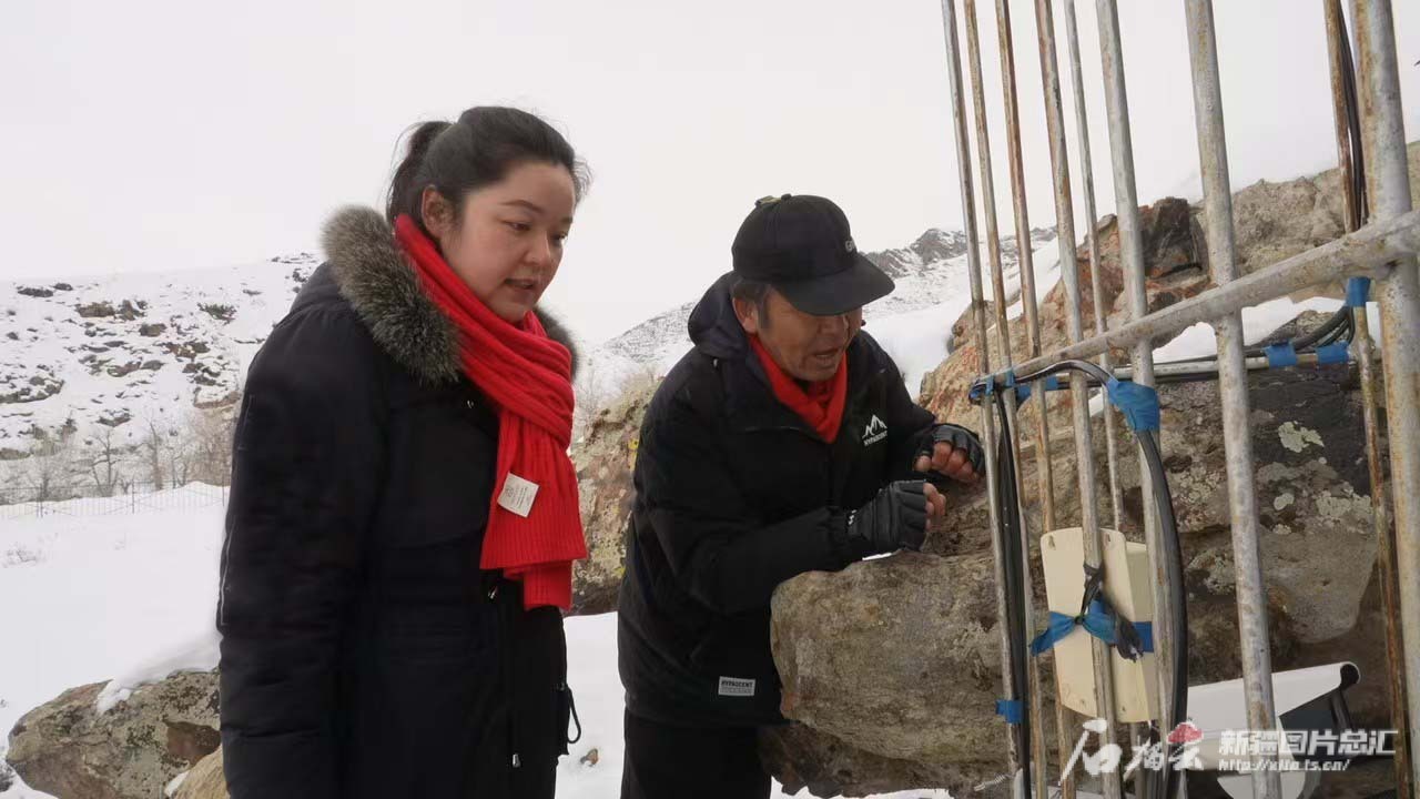 2025年2月19日,在疆全国人大代表、阿勒泰地区文博院(博物馆)馆员卓娅·巴合提与阿勒泰地区野外文物看护员张永军,在阿勒泰市汗德尕特蒙古族乡实地查看墩德布拉克洞穴彩绘岩画保护情况。代维利摄