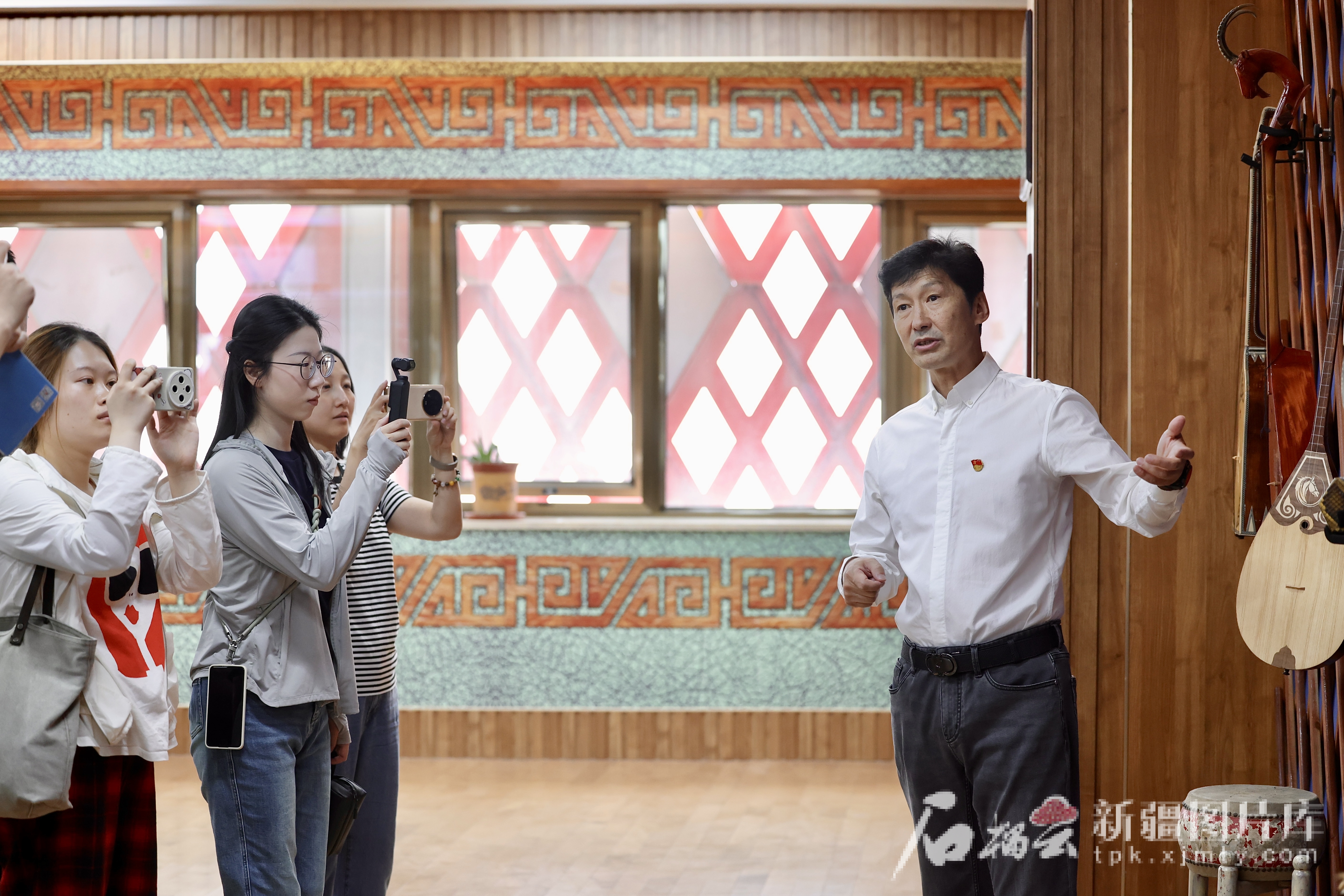 8月15日,博州歌舞团团长巴特尔在向记者介绍乐器。