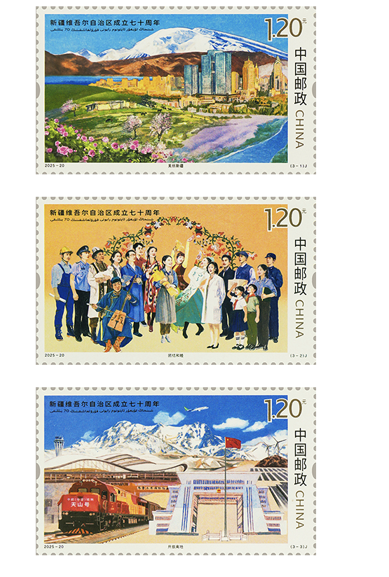 纪念邮票图案采用岩彩绘画技法创作。第一枚“美丽新疆”,画面主体为新疆城市美景,前景绽放的玫瑰代表锁边工程,背景为昆仑山慕士塔格峰和卡拉库里湖。第二枚“团结和睦”,画面表现了新疆各民族、各行业群众团结和谐、亲如一家的场景。第三枚“开放高地”,画面以中欧班列、霍尔果斯国门为主体,远景展现了乌鲁木齐国际机场、光伏电站和博格达峰。邮票充分展现了在新疆这片美丽、广袤的土地上,传统与现代交织,自然与人文共生,古老与青春共舞;生动描绘了各族群众获得感、幸福感、安全感不断增强的美好图景,各族群众像石榴籽一样紧紧抱在一起,在中国式现代化进程中更好建设团结和谐、繁荣富裕、文明进步、安居乐业、生态良好的美丽新疆。