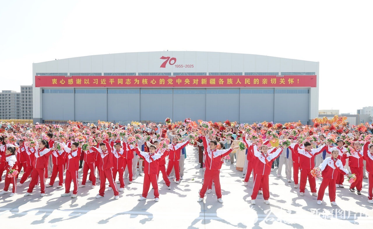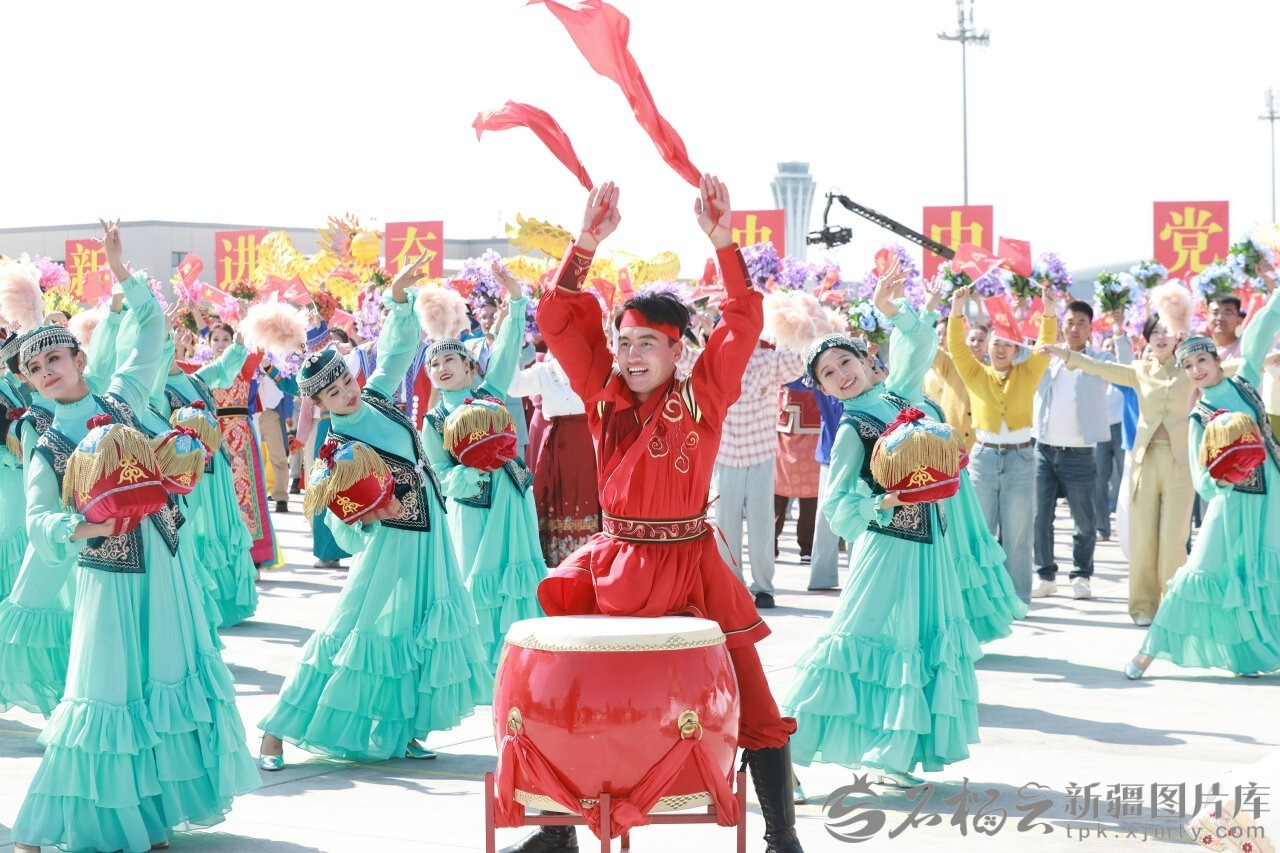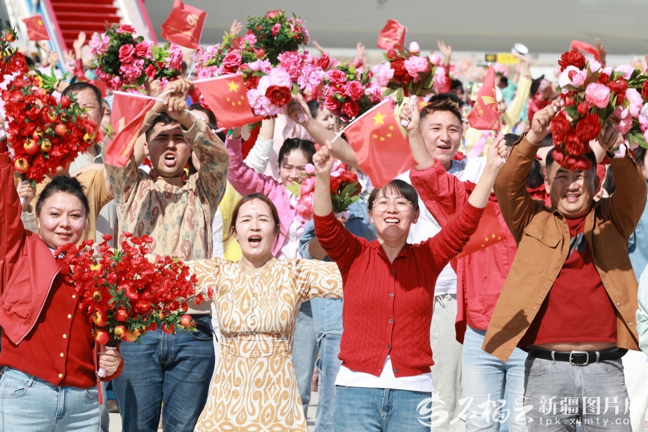 中共中央总书记、国家主席、中央军委主席习近平率中央代表团9月23日下午乘专机抵达乌鲁木齐,出席新疆维吾尔自治区成立70周年庆祝活动。自治区各族群众代表身着节日盛装,挥动红旗和五彩花束,跳起欢快的民族舞蹈,欢迎总书记的到来,表达对总书记的衷心祝福。
