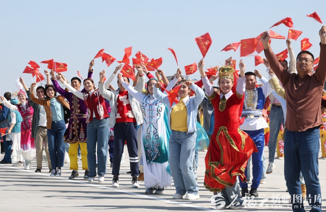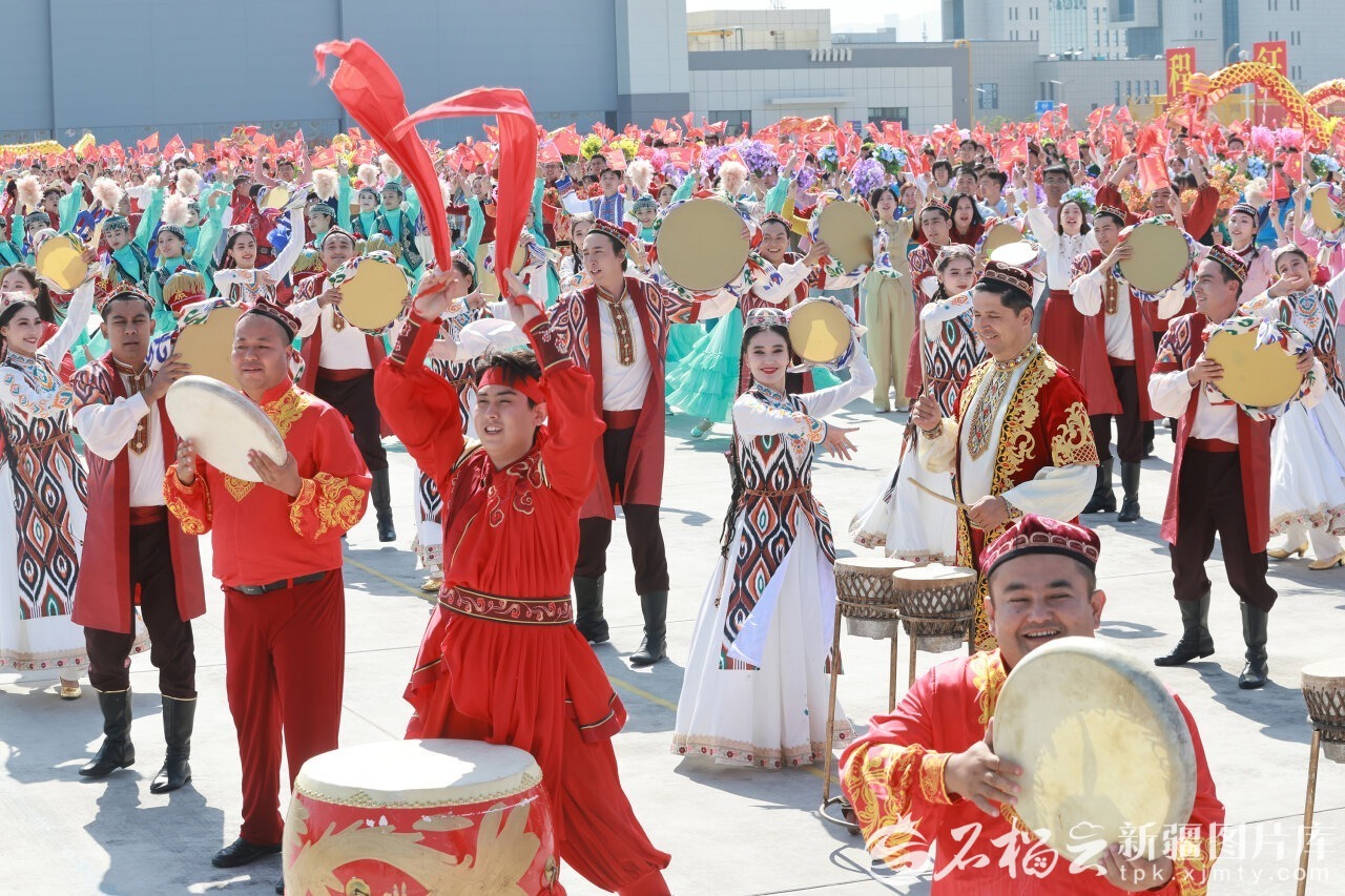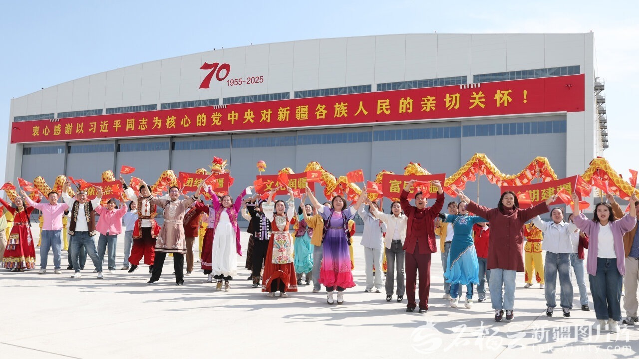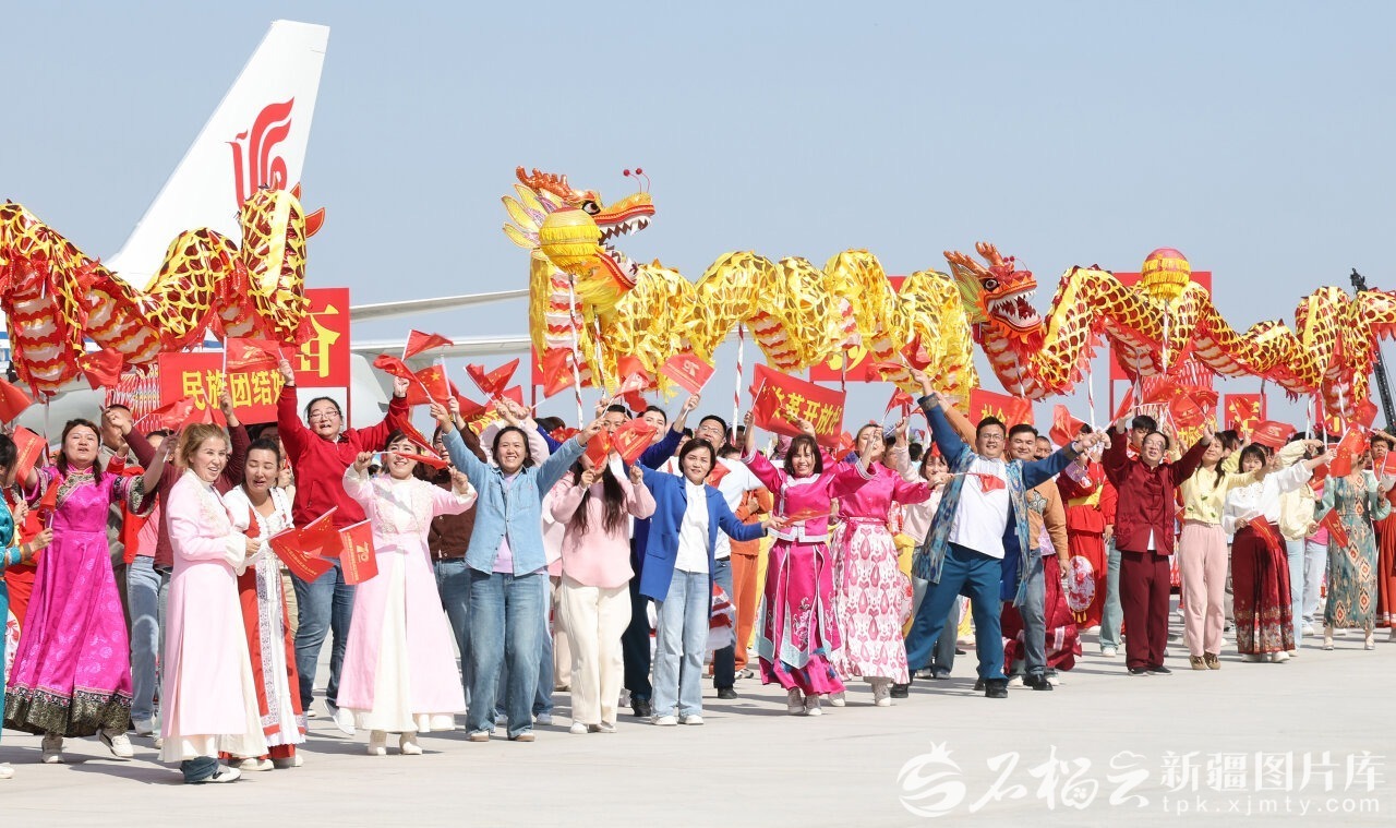 中共中央总书记、国家主席、中央军委主席习近平率中央代表团9月23日下午乘专机抵达乌鲁木齐,出席新疆维吾尔自治区成立70周年庆祝活动。自治区各族群众代表身着节日盛装,挥动红旗和五彩花束,跳起欢快的民族舞蹈,欢迎总书记的到来,表达对总书记的衷心祝福。