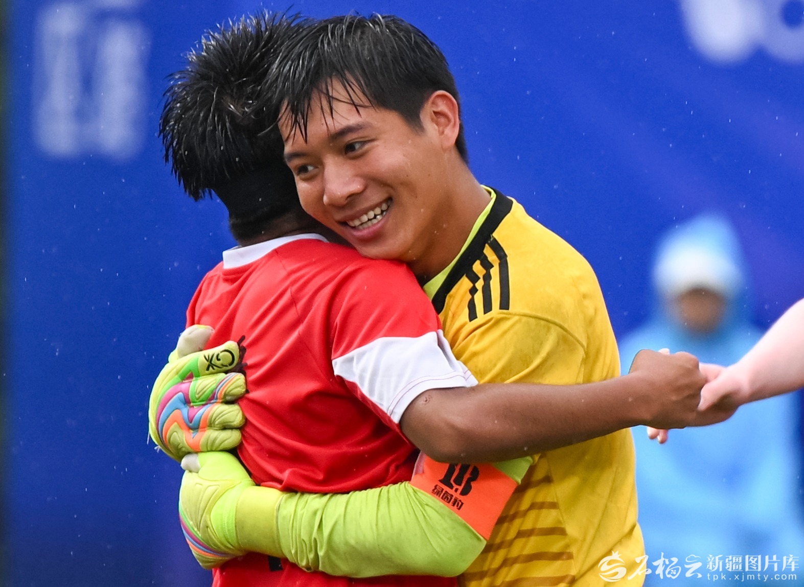 12月13日,盲人足球男子组小组赛,新疆队球员比拉力·亚森(左)得分后与守门员艾木都拉·阿力木江拥抱庆祝。残特奥会官方信息服务平台供图